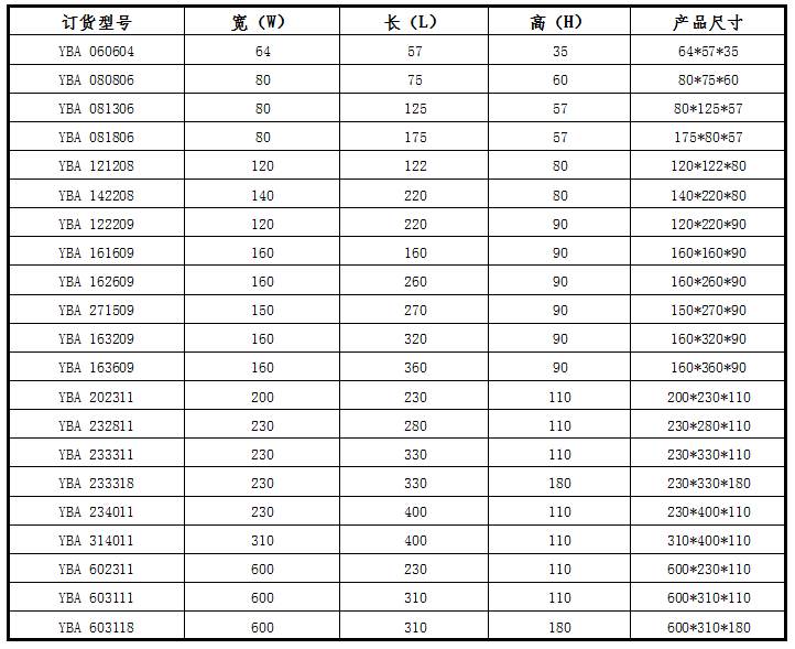 產(chǎn)品尺寸表: